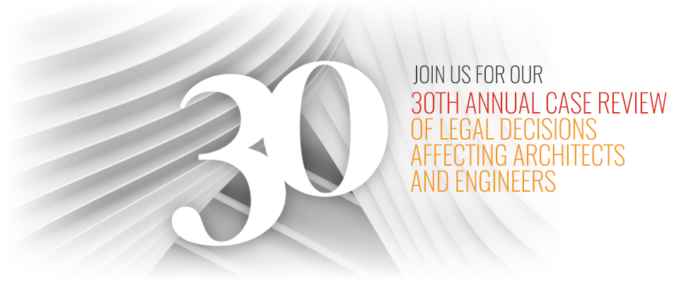 Jonathan C. Shoemaker and Paul E. Knupp, III look forward to presenting this annual seminar reviewing legal decisions from across the country affecting architects and engineers and identifying “lessons learned” for design professionals to apply to their practice. Begun in 1994 by James F. Lee, Jr., a founding member of Lee/Shoemaker PLLC, this program highlights the challenges faced by design professionals and solutions for managing those risks.