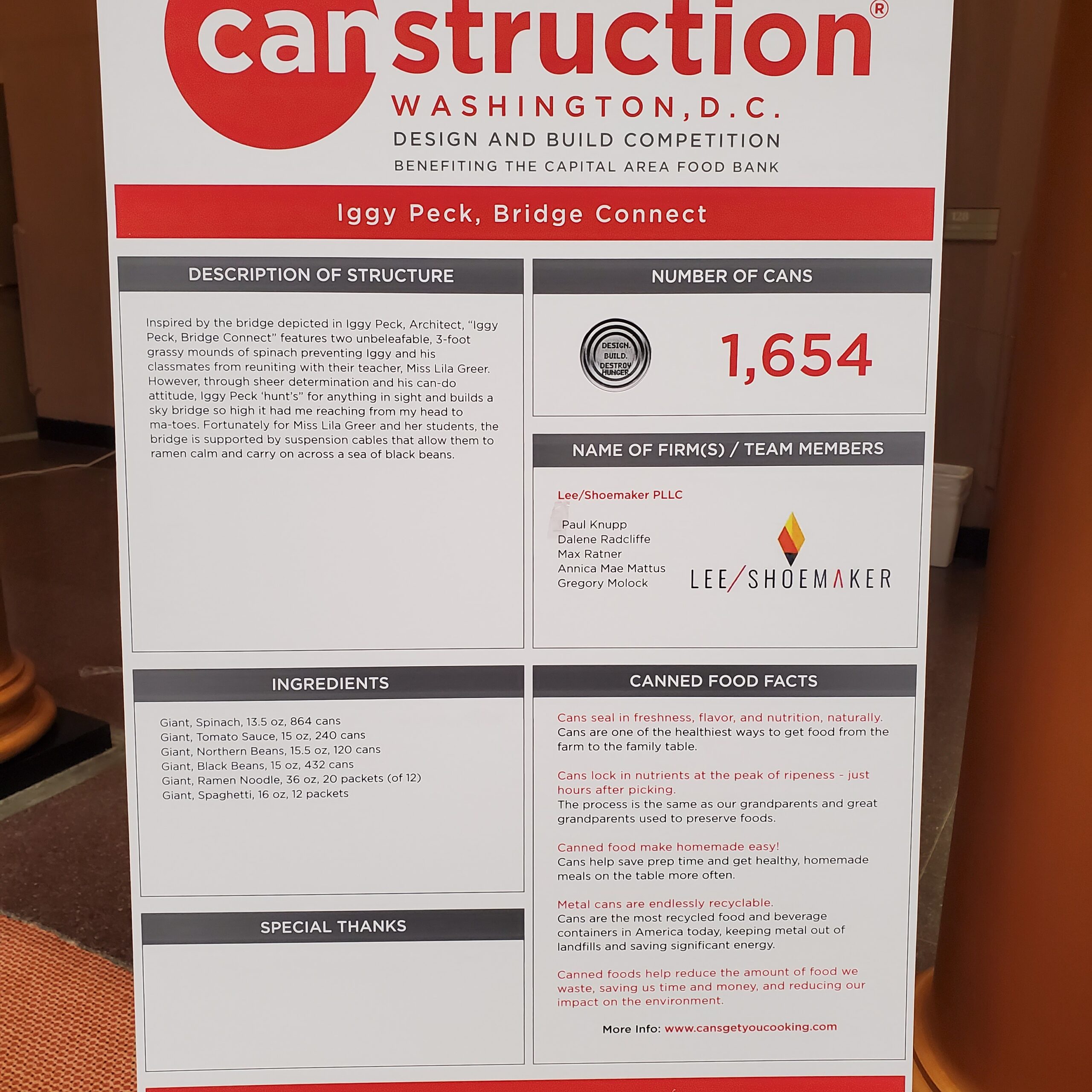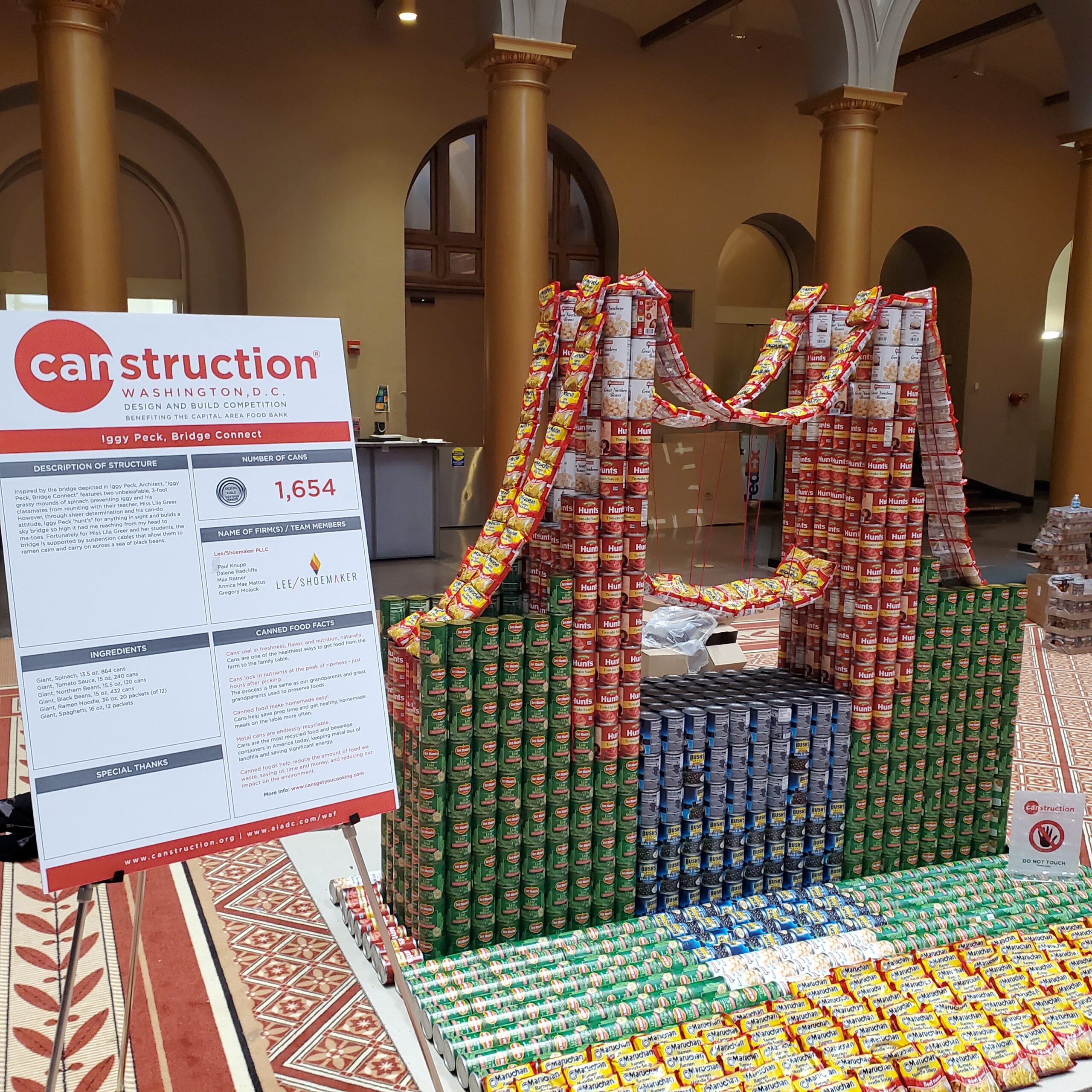 November 21, 2021, Washington, DC – A team from Lee/Shoemaker PLLC, led by Captains Paul E. Knupp, III and Dalene A. Radcliffe, participated in AIA|DC’s CANstruction 2021 at the National Building Museum. Drawing inspiration from “Iggy Peck, Architect,” the Lee/Shoemaker PLLC team built a canned (and Ramen) bridge of shoestring suspension! Congratulations to all of the teams involved in this great program benefitting the Capital Area Food Bank!