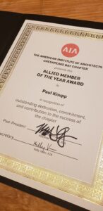 December 9, 2021, Annapolis, MD – Lee/Shoemaker PLLC is proud to announce that AIA-Chesapeake Bay honored Paul E. Knupp, III as its Allied Member of the Year for his dedication, commitment, and contribution to the success of the Chapter. Since joining the AIA-Chesapeake Bay Board of Directors, Paul has sought to leverage his experience, and the firm’s depth of knowledge, to support the mission of the Chapter and to deliver content to address the interests of the Chapter’s membership.